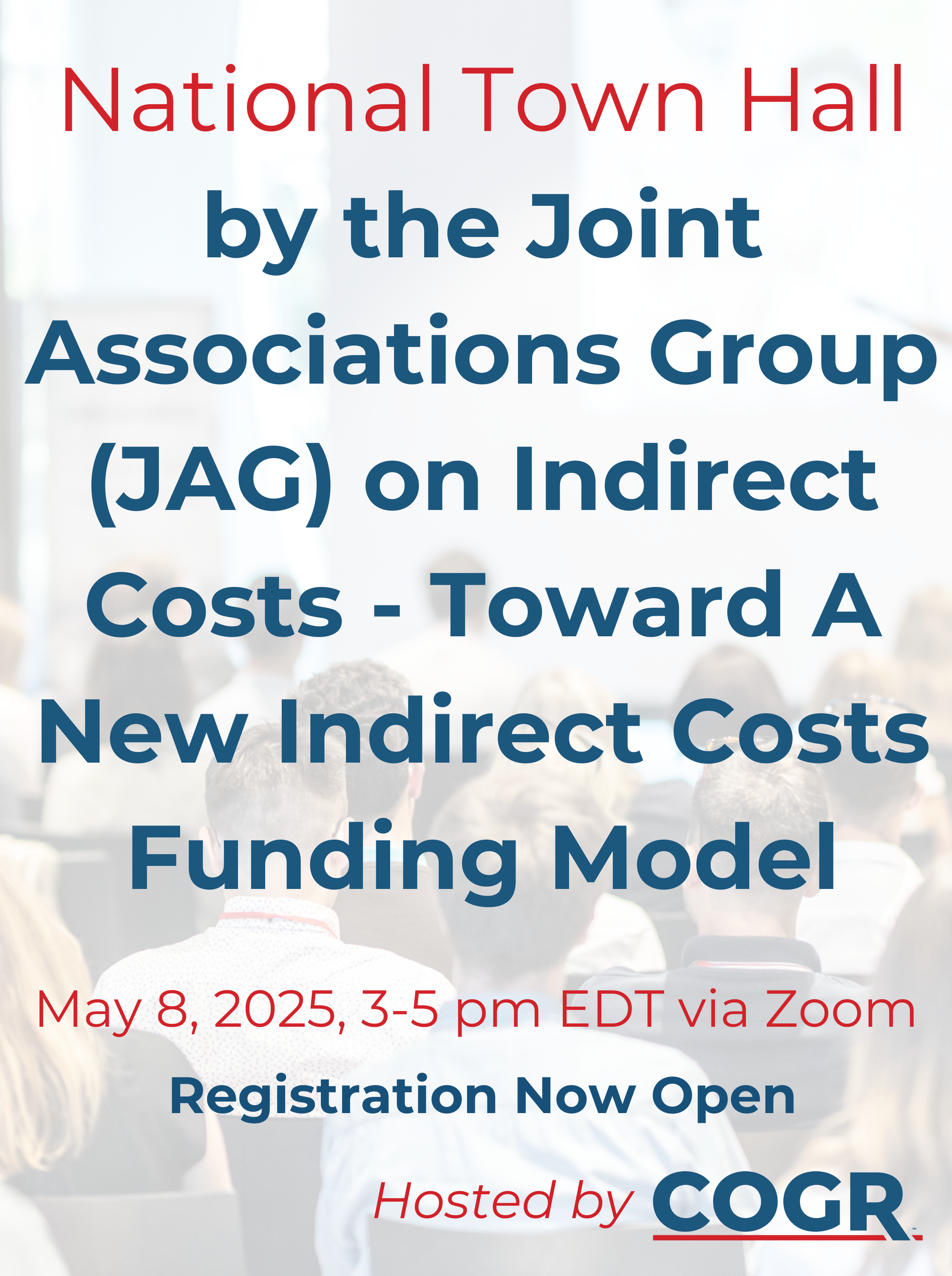 On May 8 and 12, on behalf of the Joint Associations Group (JAG) on Indirect Costs, COGR will host two town hall webinars. The webinars will include: an overview on facilities & administrative (or indirect) costs; information about the scope, structure and work of JAG and its subject matter expert group; and substantial time for audience input and Q&A. Leaders from the JAG organizations and Dr. Kelvin Droegemeier, Professor and Special Advisor to the Chancellor for Science and Policy, University of Illinois Urbana-Champaign; and former WH OSTP Director will lead the webinars.